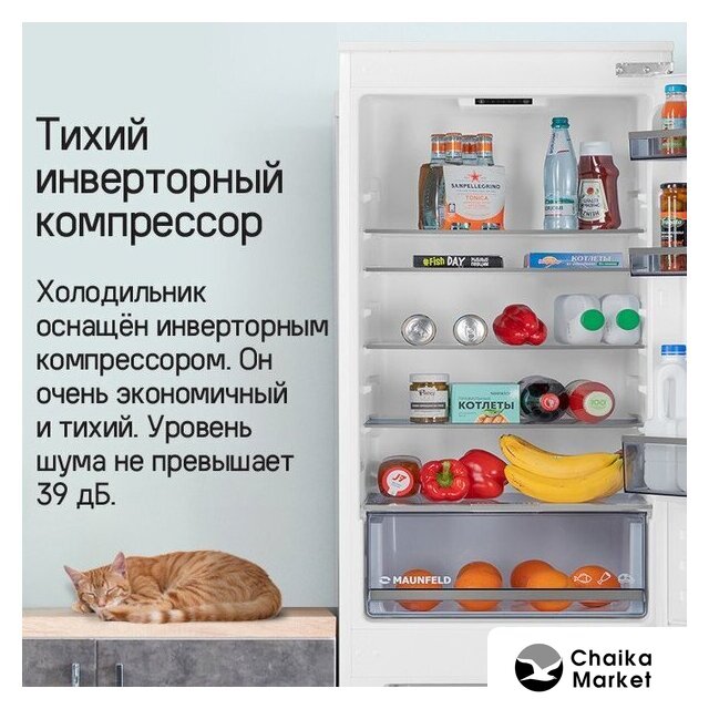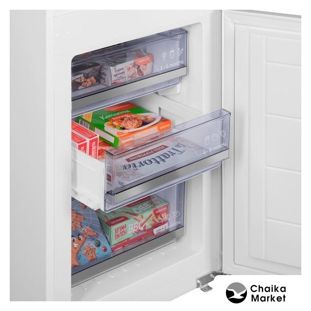 встраиваемый, скользящие направляющие, без No Frost, сенсорное управление, класс A+, полезный объём: 264 л (183 + 81 л), перенавешиваемые двери, лоток для яиц, 54.1x54.5x177 см, белый