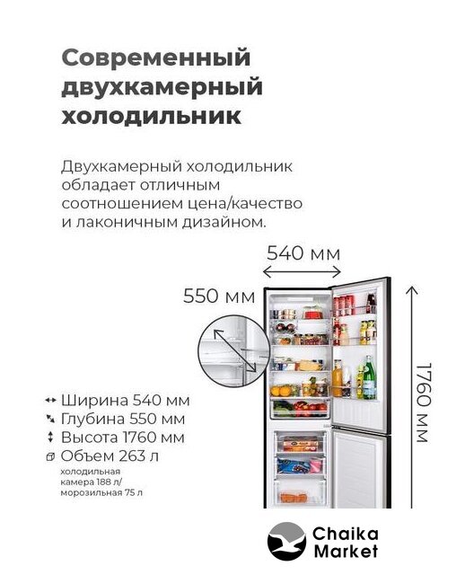 отдельностоящий, без No Frost, электронное управление, класс A+, полезный объём: 301 л (182 + 119 л), перенавешиваемые двери, лоток для яиц, 59.5x62.7x176.8 см, серебристый