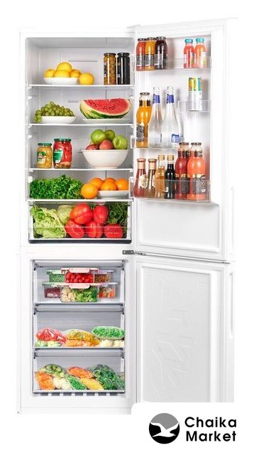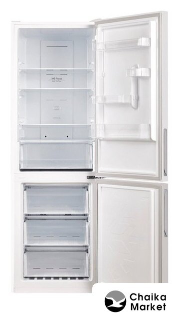 отдельностоящий, No Frost (морозильная камера), электронное управление, класс A, полезный объём: 319 л (225 + 94 л), инверторный компрессор, перенавешиваемые двери, подставка-лоток для бутылок, лоток для яиц, 59.7x67.5x185.5 см, белый