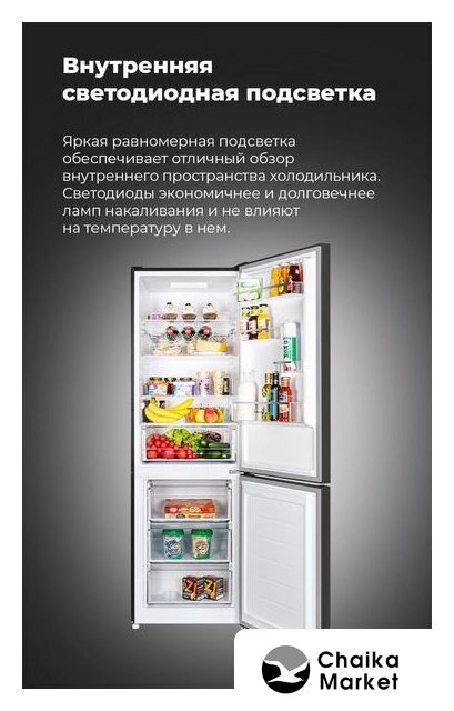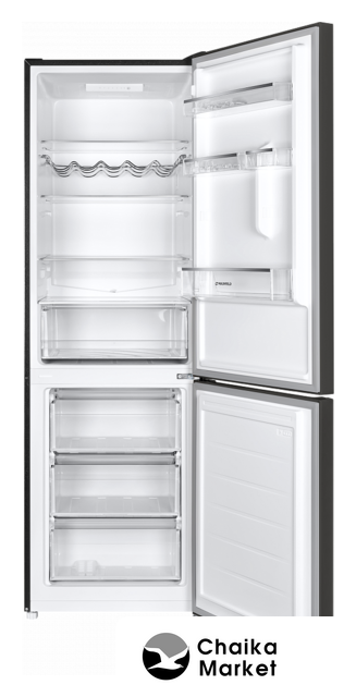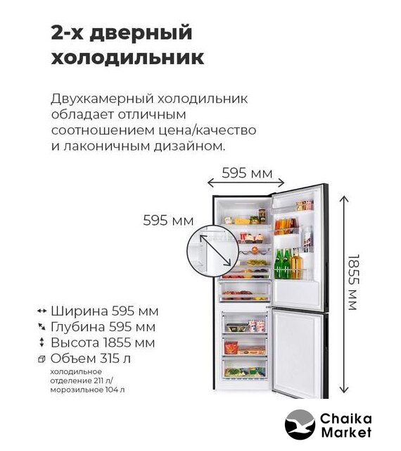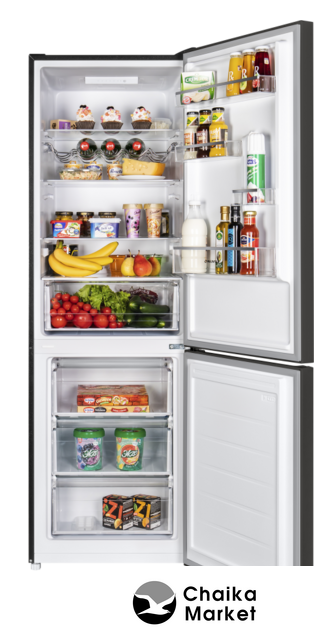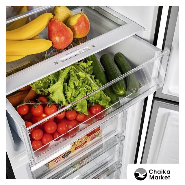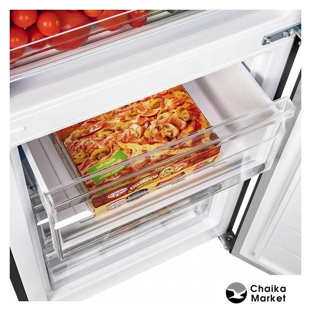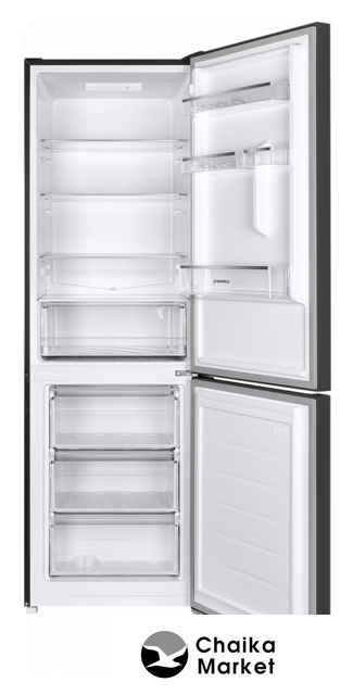 отдельностоящий, полный No Frost, электронное управление, класс A+, полезный объём: 312 л (187 + 125 л), перенавешиваемые двери, автодоводчик дверей, складная полка, полка для вина, лоток для яиц, 59.5x66x196.8 см, темная сталь
