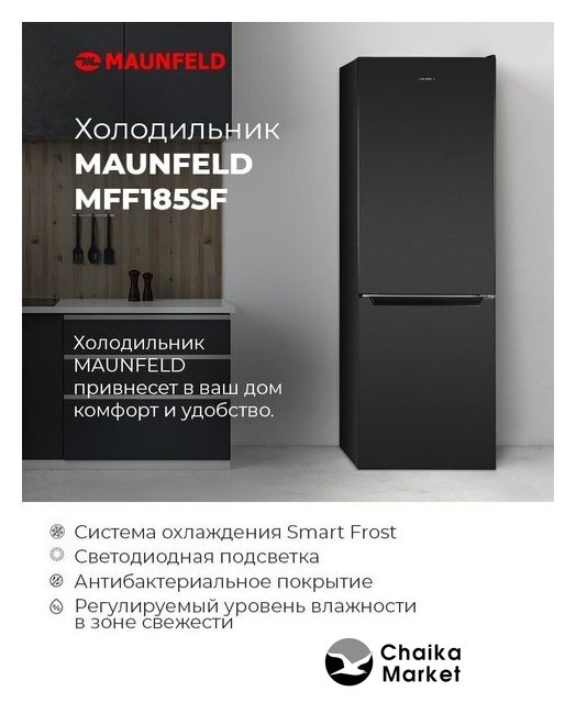отдельностоящий, полный No Frost, электронное управление, класс A+, полезный объём: 312 л (187 + 125 л), перенавешиваемые двери, автодоводчик дверей, складная полка, полка для вина, лоток для яиц, 59.5x66x196.8 см, темная сталь