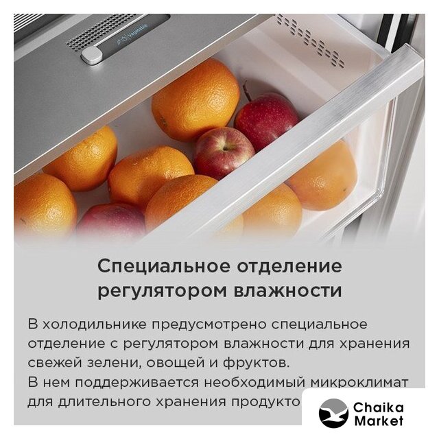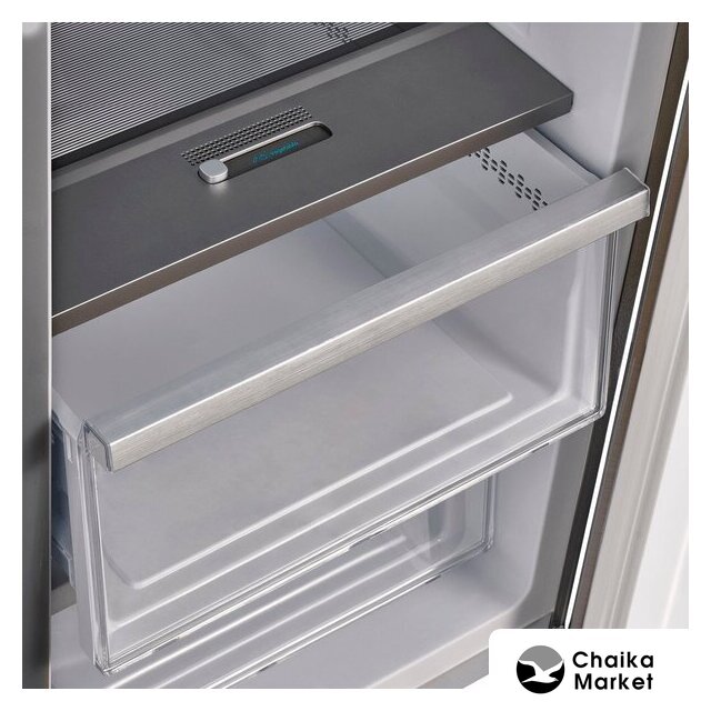 отдельностоящий, No Frost (морозильная камера), электронное управление, класс A++, полезный объём: 308 л (185 + 123 л), инверторный компрессор, перенавешиваемые двери, подставка-лоток для бутылок, лоток для яиц, 59.7x67.5x185.5 см, серебристый