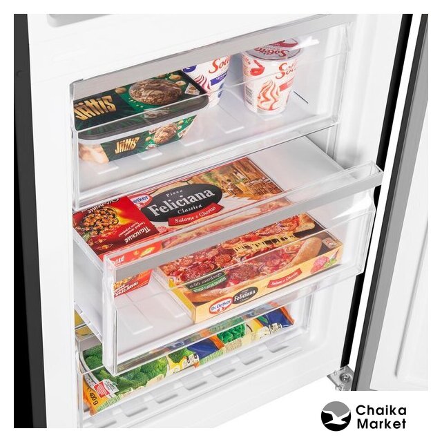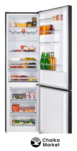 отдельностоящий, полный No Frost, электронное управление, класс A+, полезный объём: 351 л (257 + 94 л), зона свежести, перенавешиваемые двери, полка для вина, лоток для яиц, 59.5x63.5x200 см, черный