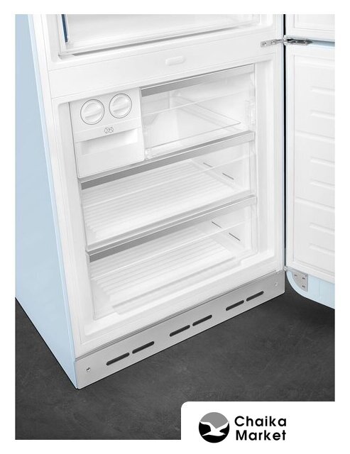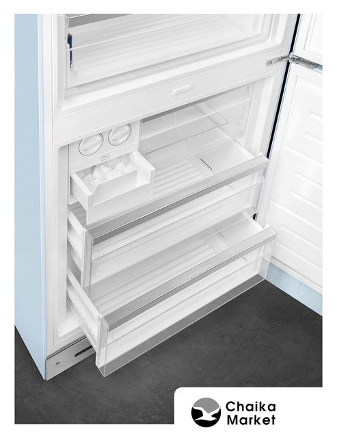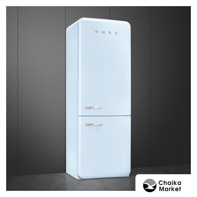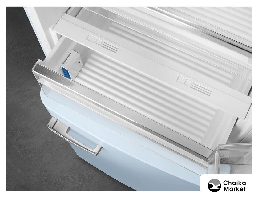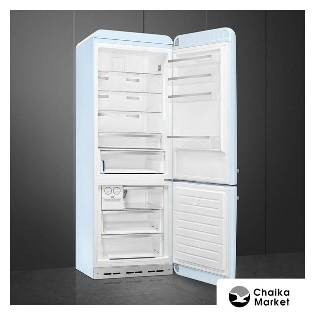 отдельностоящий, полный No Frost, механическое управление, класс A++, полезный объём: 467 л (351 + 116 л), зона свежести, лоток для яиц, отделка: ретродизайн, 79.6x85.1x177.7 см, бирюзовый