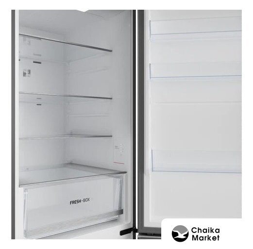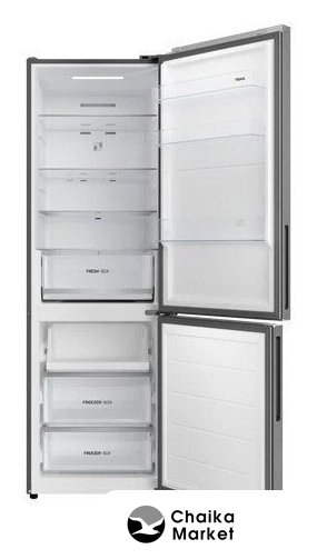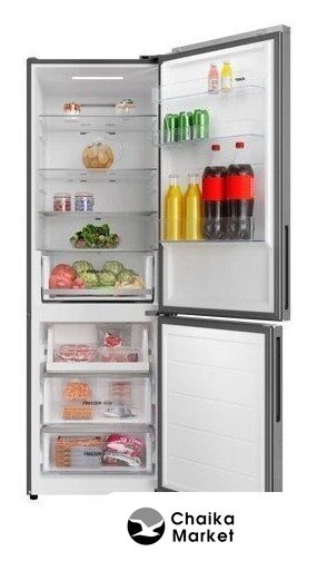 отдельностоящий, полный No Frost, сенсорное управление, полезный объём: 355 л (249 + 106 л), перенавешиваемые двери, подставка-лоток для бутылок, лоток для яиц, 59.5x66.3x203.5 см, нержавеющая сталь
