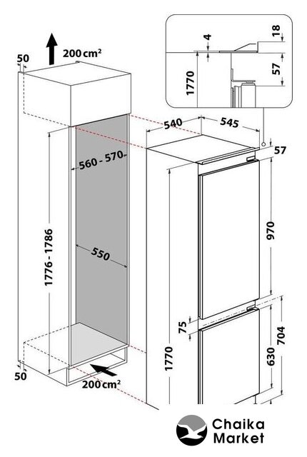 встраиваемый, жесткое, без No Frost, сенсорное управление, полезный объём: 264 л (183 + 81 л), перенавешиваемые двери, лоток для яиц, 55.9x54.6x177 см, белый