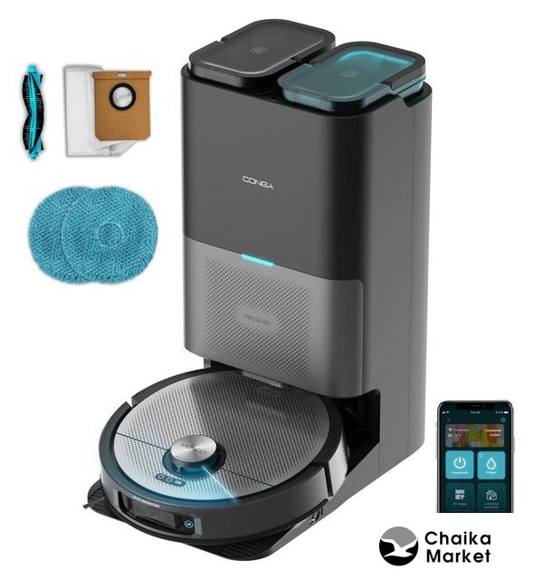 | Комплектация | база самоочистки; боковая щетка; щетка мультифункциональная; вращающиеся швабры; бутылка для моющего средства; мешок для пыли |