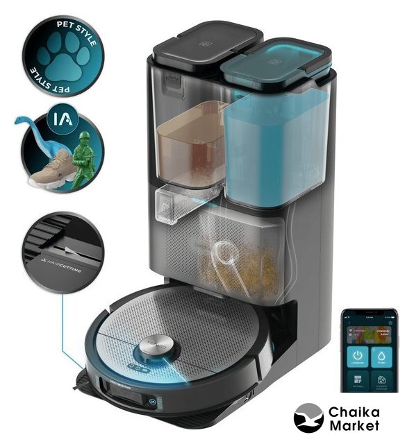 влажная уборка, фирменное приложение, сила всасывания 11000 Па, пылесборник 0.3 л, с турбощеткой, навигация: контактный бампер, лидар, датчики перепада высоты, лазерные датчики препятствий, база самоочистки