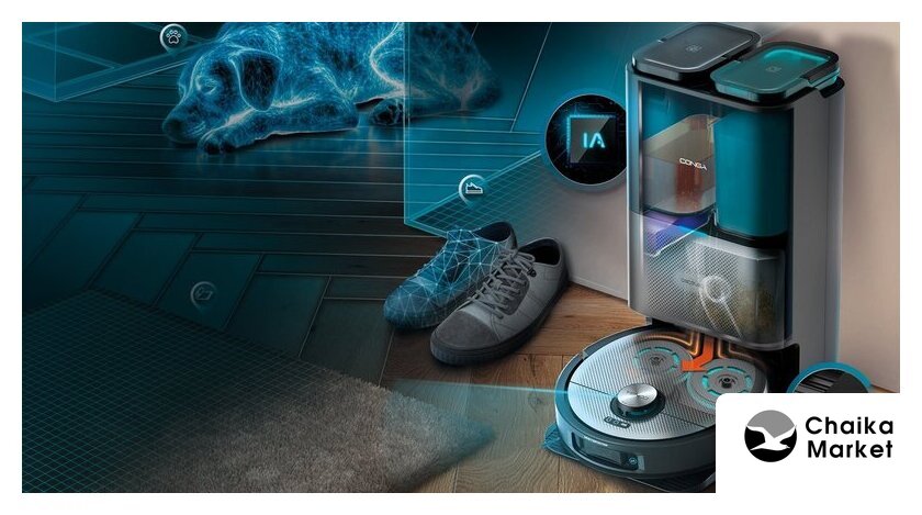 влажная уборка, сила всасывания 18000 Па, с турбощеткой, навигация: контактный бампер, камера TOF (3D), датчики перепада высоты, база самоочистки
