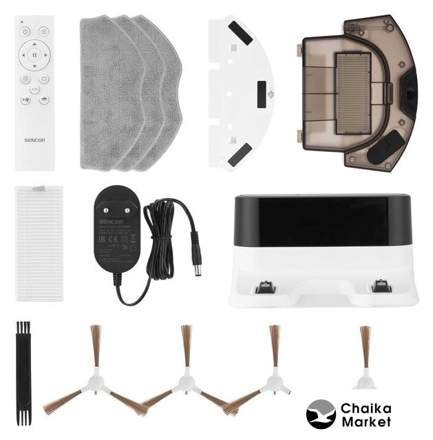 | Комплектация | две боковые щетки и фильтры, зарядная станция, пульт дистанционного управления, насадка для мытья, три насадки для мытья, две запасные боковые вращающиеся щетки, запасной фильтр HEPA, запасной пористый фильтр, щетка для чистки, две батареи типа AAA |