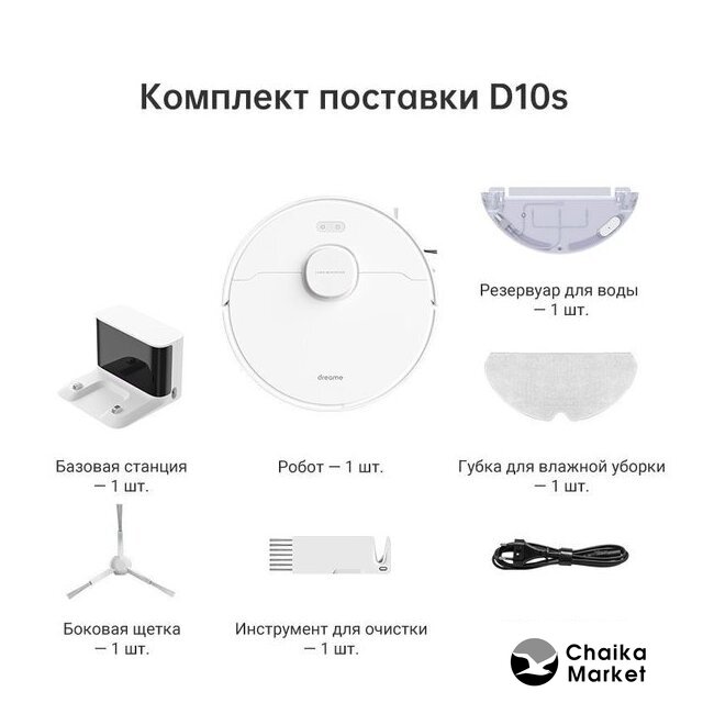 Комплектация | Робот-пылесосРезервуар для воды с тряпкойБазовая станцияЗапасная боковая щеткаИнструмент для очисткиКабель питания |