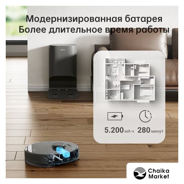 влажная уборка, фирменное приложение, мощность 50 Вт, сила всасывания 4000 Па, пылесборник 0.3 л, с турбощеткой, навигация: контактный бампер, лидар, датчики перепада высоты, база самоочистки