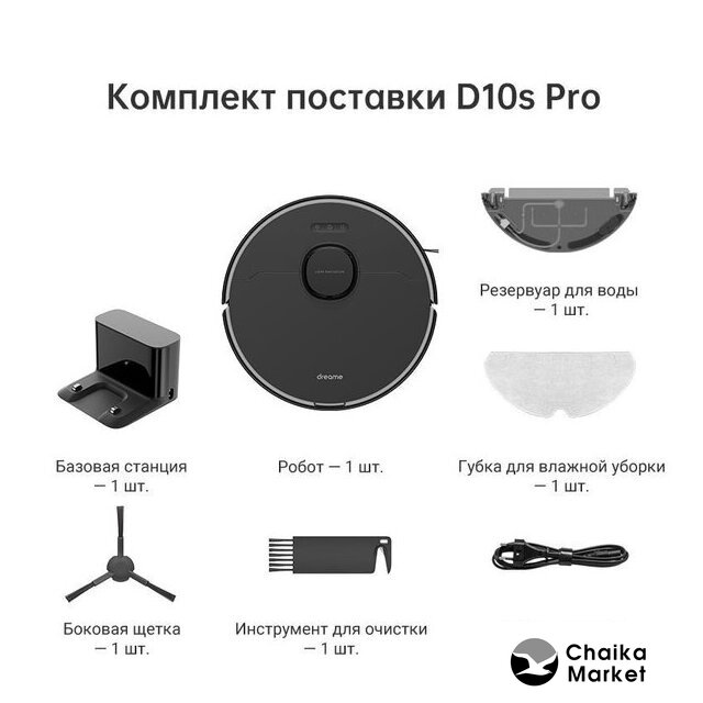 Комплектация | Робот-пылесосРезервуар для воды с тряпкойБазовая станцияЗапасная боковая щеткаИнструмент для очисткиКабель питания |
