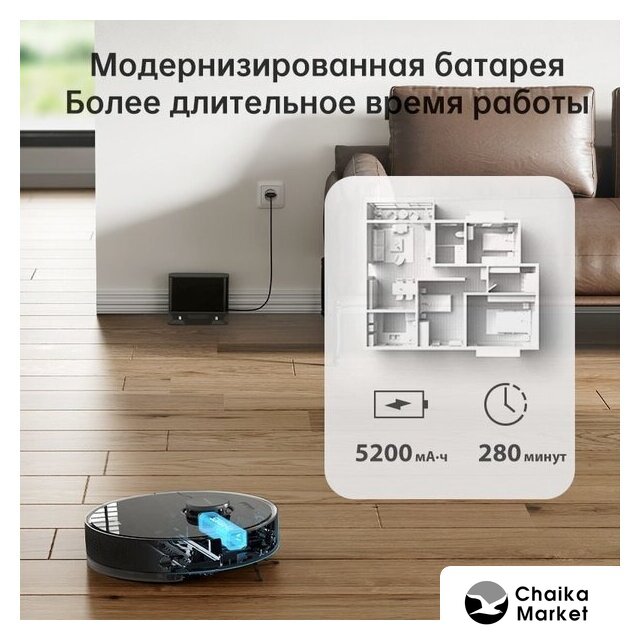 влажная уборка, фирменное приложение, мощность 50 Вт, сила всасывания 4000 Па, пылесборник 0.3 л, с турбощеткой, навигация: контактный бампер, лидар, датчики перепада высоты, база самоочистки