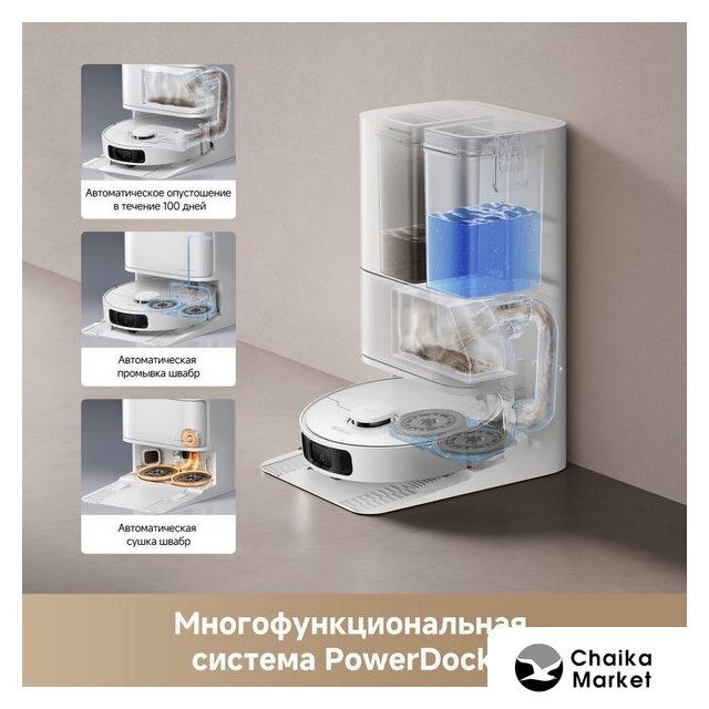 Функциональные особенности базы | автоматическая мойка швабры, автоматическая сушка швабры, самоочистка пылесборника пылесоса, автоматическая заправка водой |