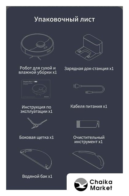Комплектация | Зарядная станция Приспособление для чистки Кабель питания Контейнер для воды Насадка-тряпка |