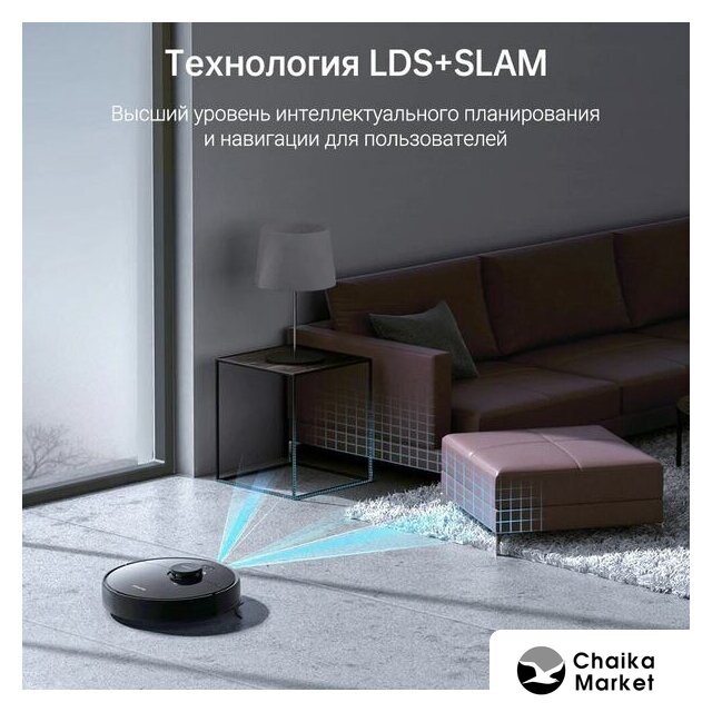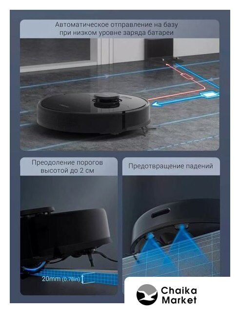влажная уборка, фирменное приложение, сила всасывания 10000 Па, с турбощеткой, навигация: контактный бампер, лидар, датчики перепада высоты, лазерные датчики препятствий