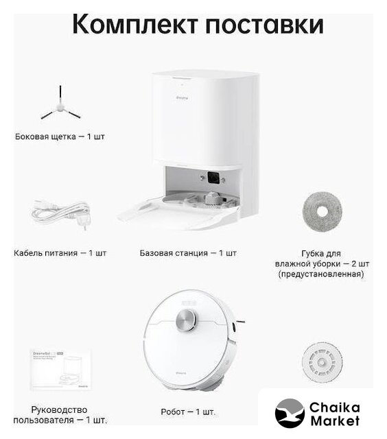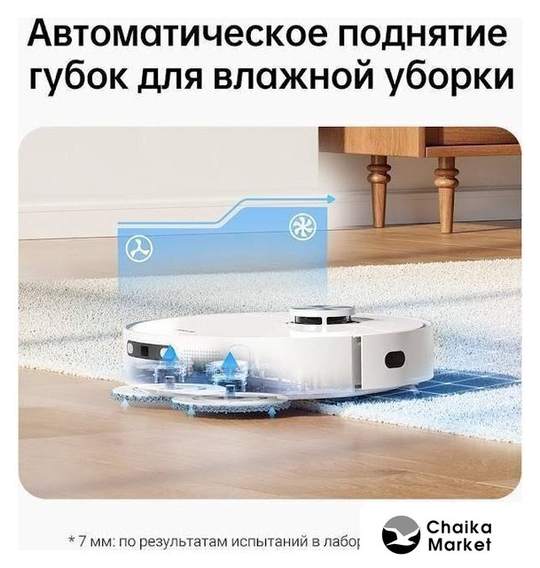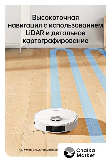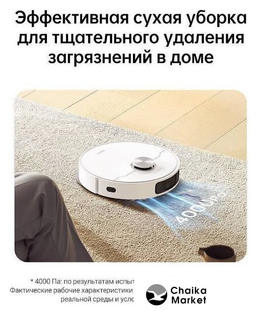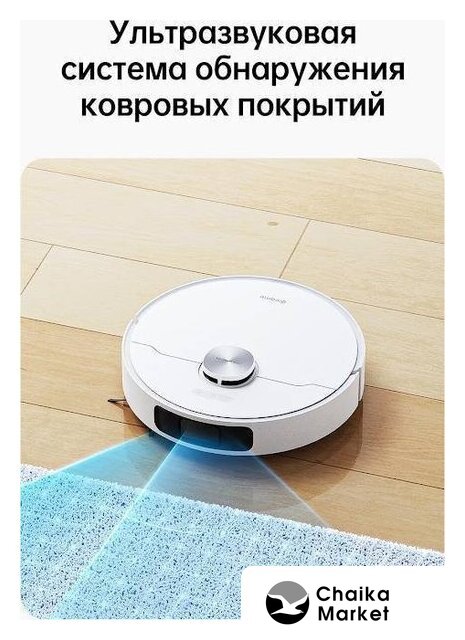 влажная уборка, фирменное приложение, сила всасывания 10000 Па, с турбощеткой, навигация: контактный бампер, лидар, датчики перепада высоты, лазерные датчики препятствий