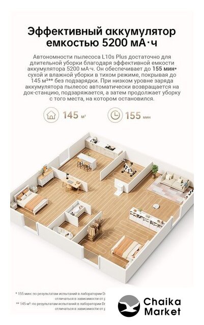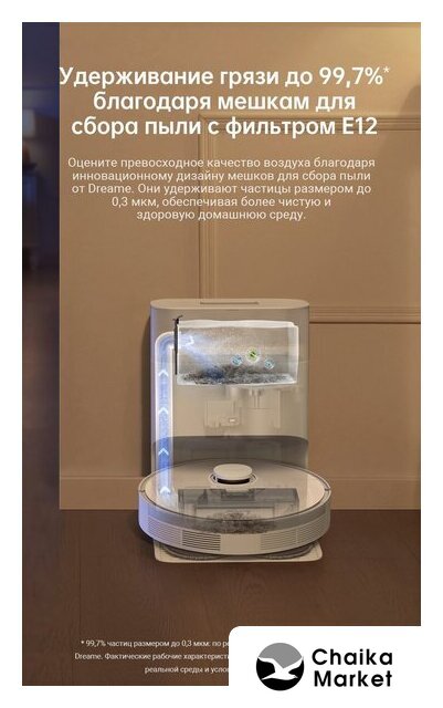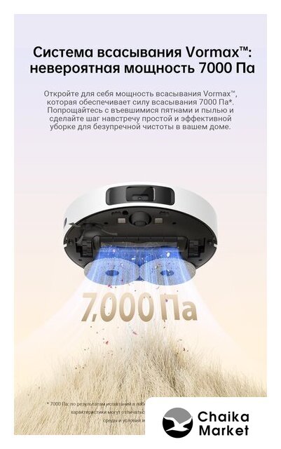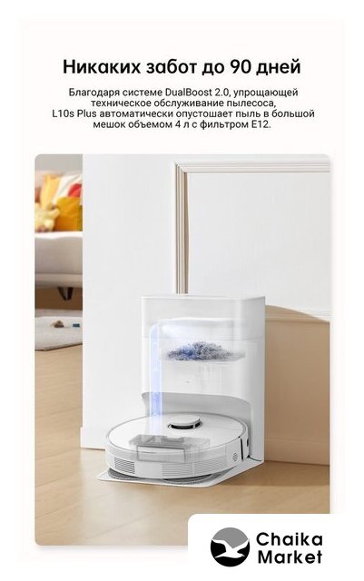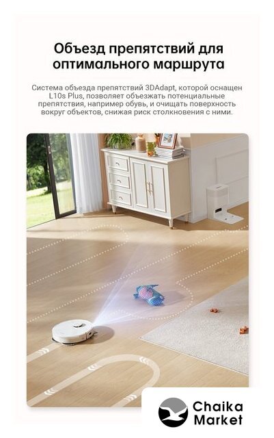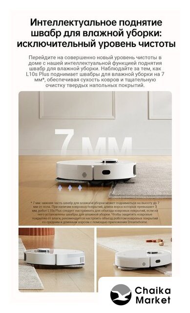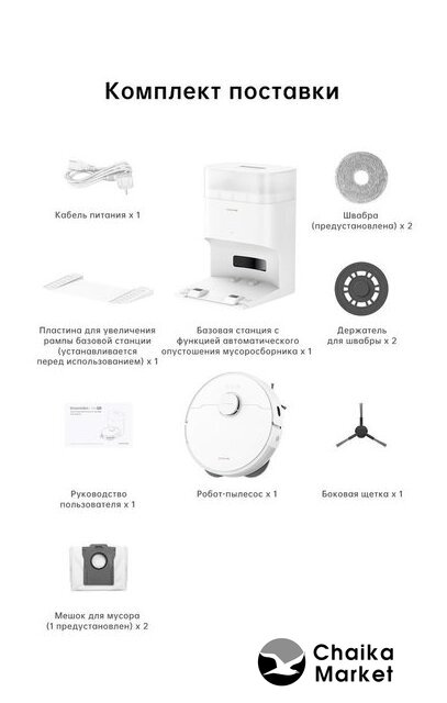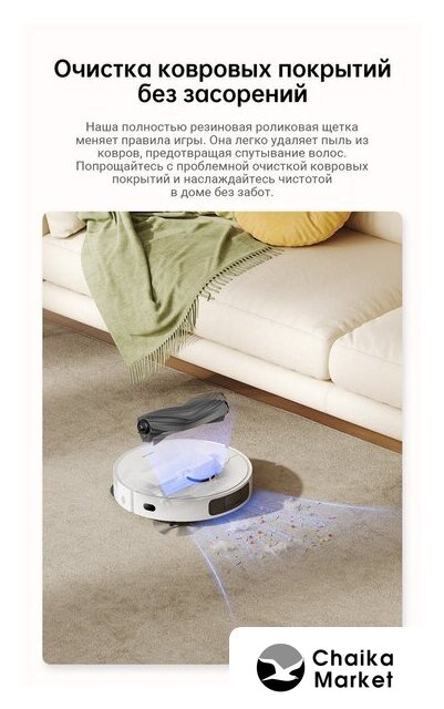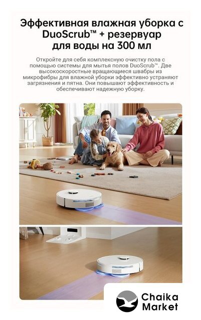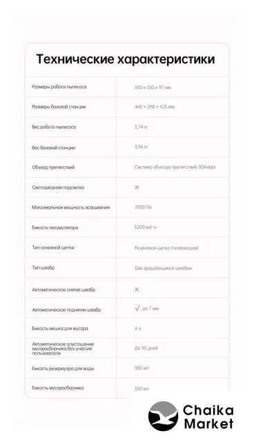 влажная уборка, фирменное приложение, мощность 32 Вт, сила всасывания 2500 Па, пылесборник 0.8 л, с турбощеткой, навигация: контактный бампер, лидар, датчики перепада высоты