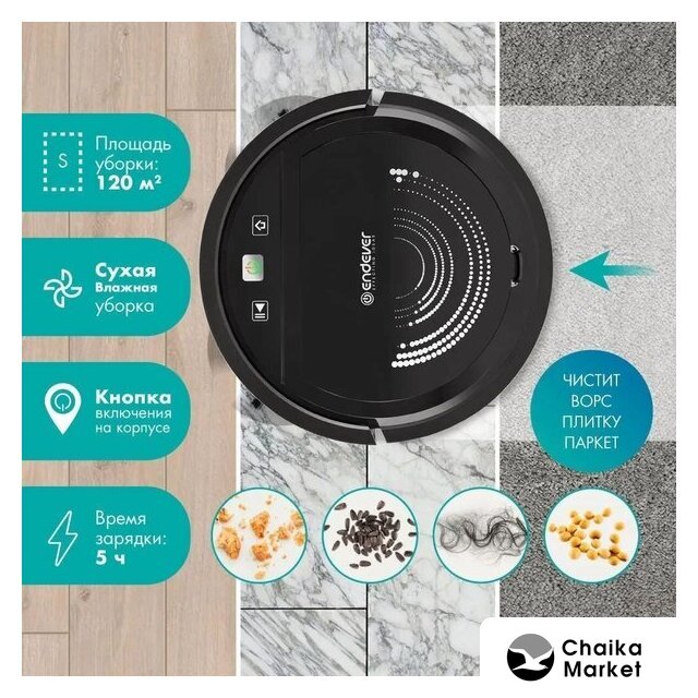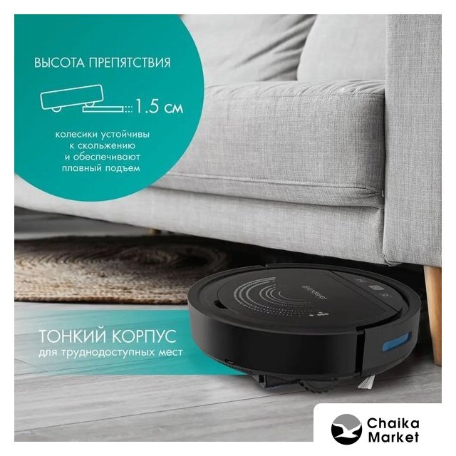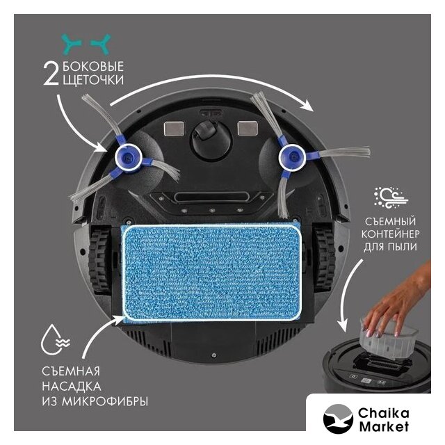 влажная уборка, сила всасывания 350 Па, пылесборник 0.2 л, навигация: контактный бампер, датчики перепада высоты
