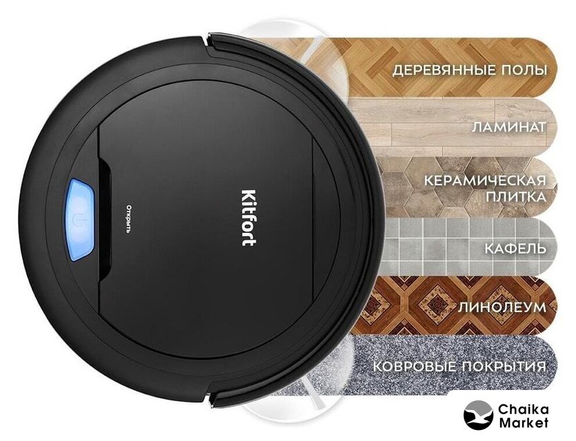 сухая уборка, сила всасывания 800 Па, пылесборник 0.45 л, навигация: контактный бампер, датчики перепада высоты