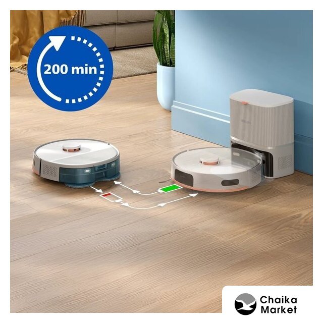 влажная уборка, мощность 50 Вт, сила всасывания 3200 Па, пылесборник 0.2 л, с турбощеткой, навигация: контактный бампер, лидар, датчики перепада высоты, план нескольких этажей, база самоочистки