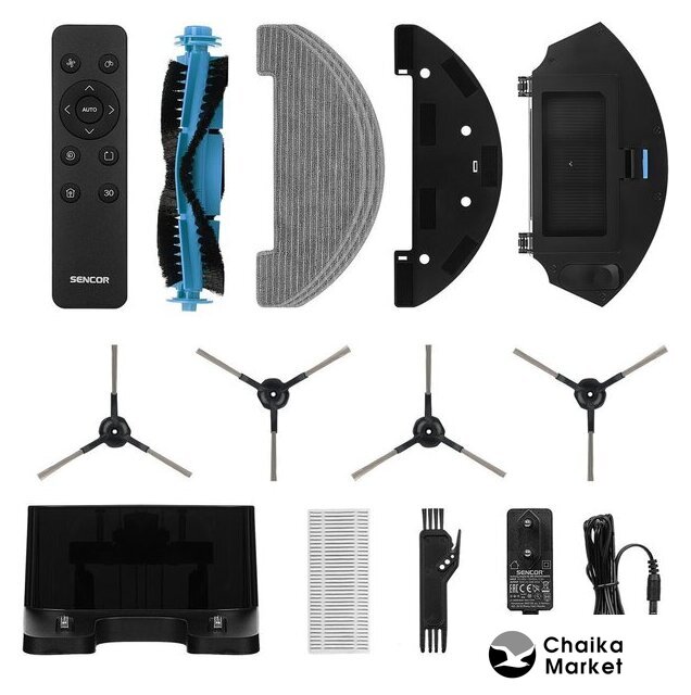 | Комплектация | зарядная станция, пульт дистанционного управления, адаптер питания, 2 запасные боковые щетки, запасной HEPA-фильтр, запасной поролоновый фильтр, 3 текстильные салфетки для влажной уборки, насадка для влажной уборки, щетка для чистки |