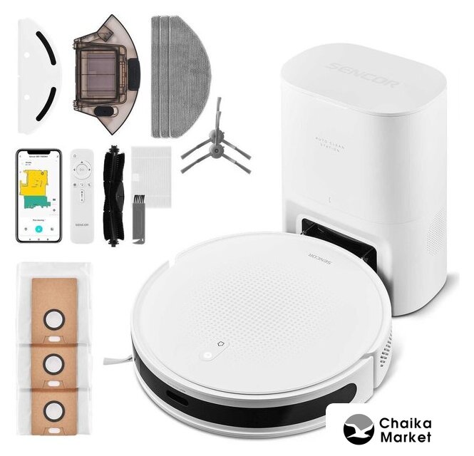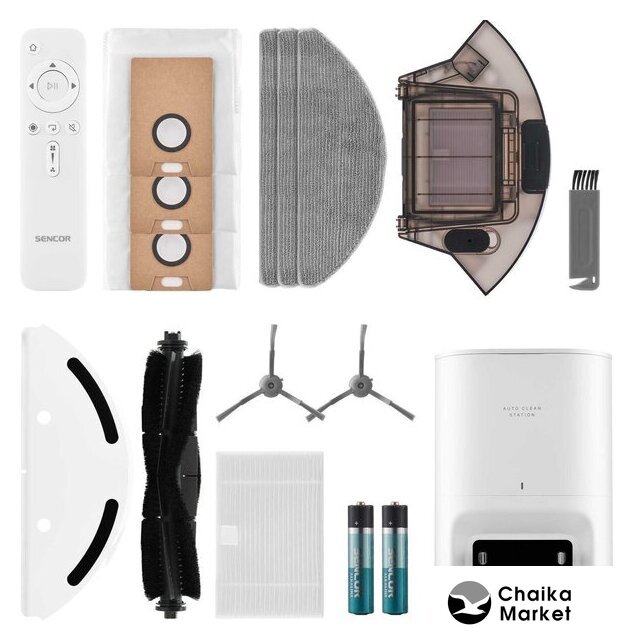 | Комплектация | боковая щетка и фильтры, зарядная станция, пульт дистанционного управления, насадка для влажной уборки, 3 сменные салфетки для влажной уборки, сменная боковая щетка, запасной HEPA-фильтр, запасной поролоновый фильтр, щётка для очистки, 2 батарейки AAA |