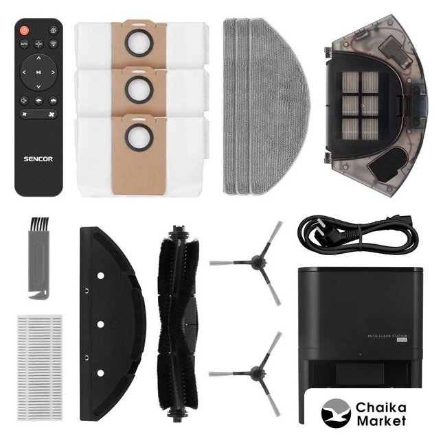 | Комплектация | боковая щетка и фильтры, автоматическая станция сбора пыли с мешком, пульт дистанционного управления, насадка для влажной уборки, 3 сменных мопа, запасная боковая щетка, запасной HEPA-фильтр, 2 запасных мешка для базы, запасной поролоновый фильтр, щетка для чистки, 2 батарейки AAA |