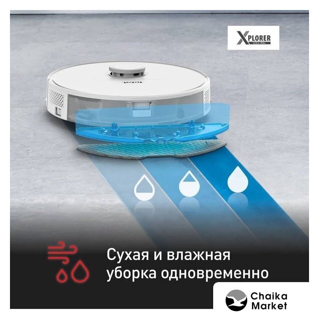 влажная уборка, пылесборник 0.12 л, с турбощеткой, навигация: контактный бампер, лидар, датчики перепада высоты, план нескольких этажей