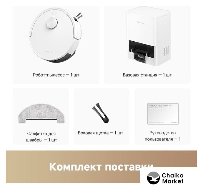 Комплектация | Робот-пылесосБазовая станцияСалфетка для швабрыБоковая щеткаАдаптер питания |