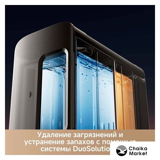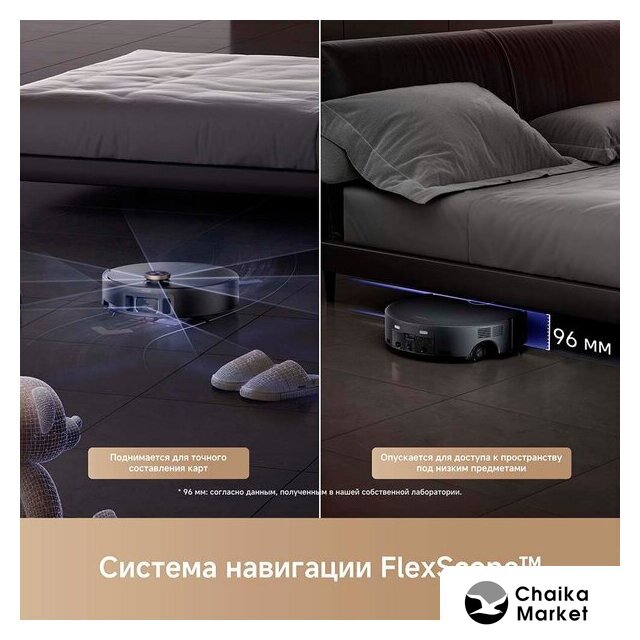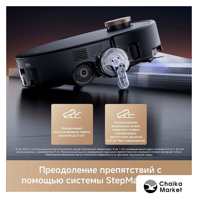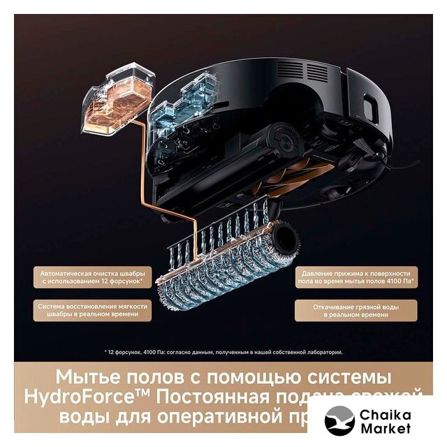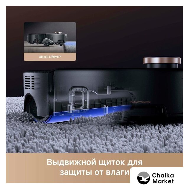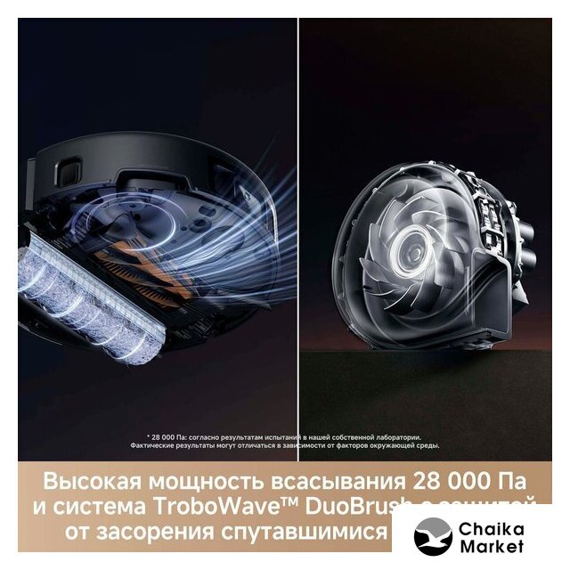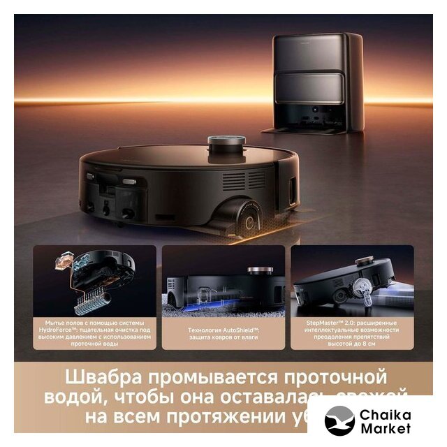 влажная уборка, фирменное приложение, сила всасывания 18500 Па, с турбощеткой (двойная), навигация: контактный бампер, лидар, камера TOF (3D), датчики перепада высоты, база самоочистки