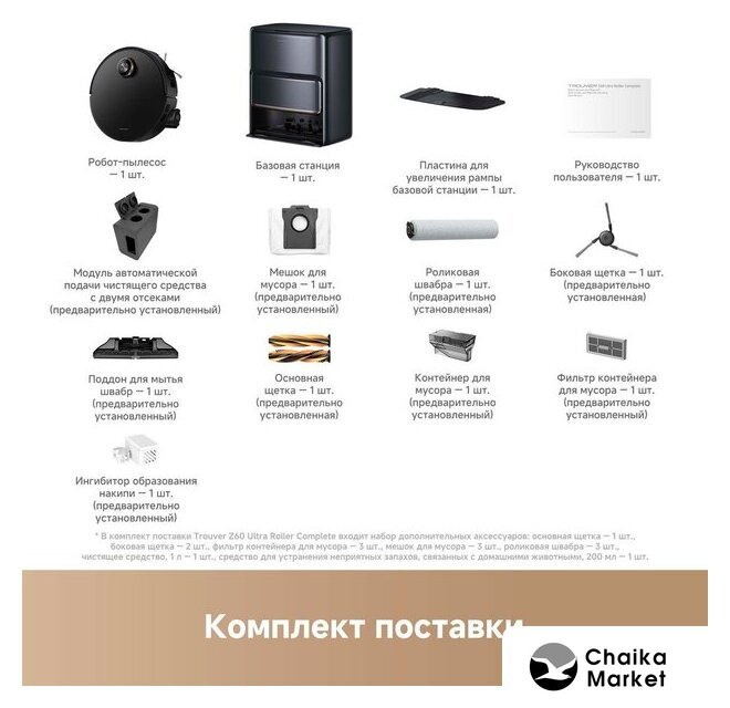 Комплектация | Основная комплектация:Робот-пылесос — 1 шт.Базовая станция — 1 шт.Пластина для увеличения рампы базовой станции — 1 шт.Руководство пользователя — 1 шт.Модуль автоматической подачи чистящего средства с двумя отсеками (предварительно установлен)Мешок для мусора — 1 шт. (предварительно установлен)Роликовая швабра — 1 шт. (предварительно установлена)Боковая щетка — 1 шт. (предварительно установлена)Поддон для мытья швабр — 1 шт. (предварительно установлен)Основная щетка — 1 шт. (предварительно установлена)Контейнер для мусора — 1 шт. (предварительно установлен)Фильтр контейнера для мусора — 1 шт. (предварительно установлен)Ингибитор образования накипи — 1 шт. (предварительно установлен)Дополнительная комплектация Complete:Основная щетка — 1 шт.Боковая щетка — 2 шт.Фильтр контейнера для мусора — 3 шт.Мешок для мусора — 3 шт.Роликовая швабра — 3 шт.Ингибитор образования накипи — 1 шт.Средство для устранения неприятных запахов, связанных с домашними животными — 200 мл — 1 шт. |