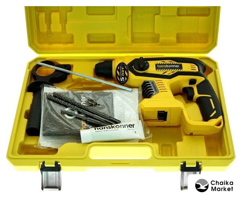 Комплект поставки | - дополнительная рукоятка- ограничитель глубины сверления- 3 сверла- 1 плоское зубило- документацияПоставляется в пластиковом кейсе |