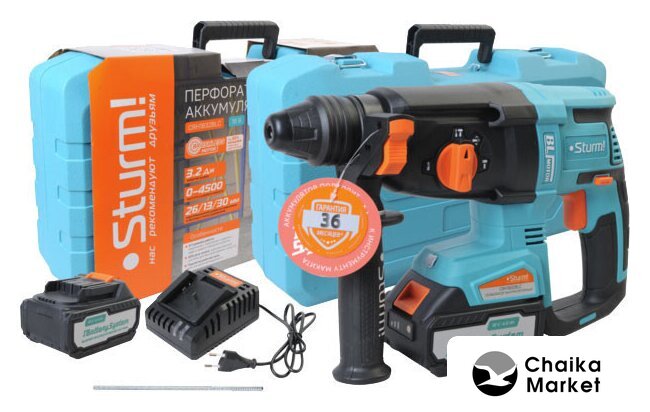 Комплект поставки | - Перфоратор аккумуляторный (1 шт)- Боковая рукоятка (1 шт)- Ограничитель глубины сверления (1 шт)- Аккумуляторная батарея 4.0 Ач (1 шт)- Зарядное устройство (1 шт)- Пластиковый кейс (1 шт) |
