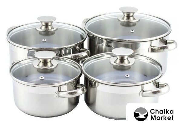 набор кастрюль, нержавеющая сталь, покрытие отсутствует, крышка стеклянная
