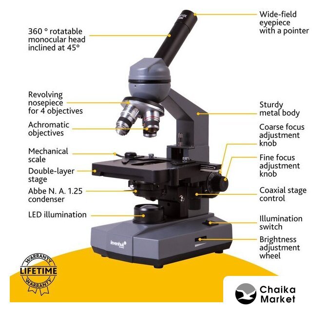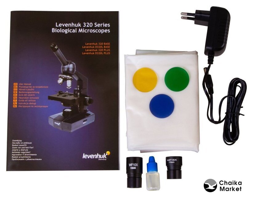 Состав набора | микроскоп, ахроматические объективы: 4х, 10х, 40х и 100х (масляная иммерсия), широкоугольные окуляры с указателем: WF10x и WF16x, фильтры: синий, зеленый, желтый, флакон иммерсионного масла, сетевой адаптер, пылезащитный чехол, инструкция по эксплуатации и гарантийный талон |