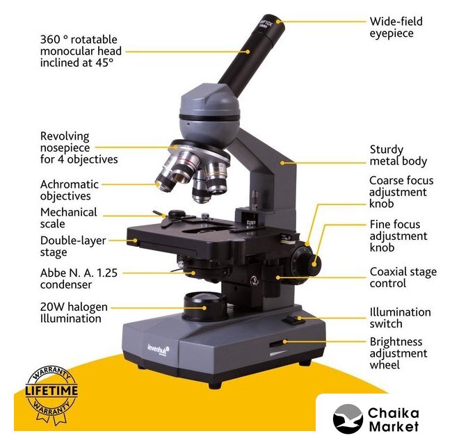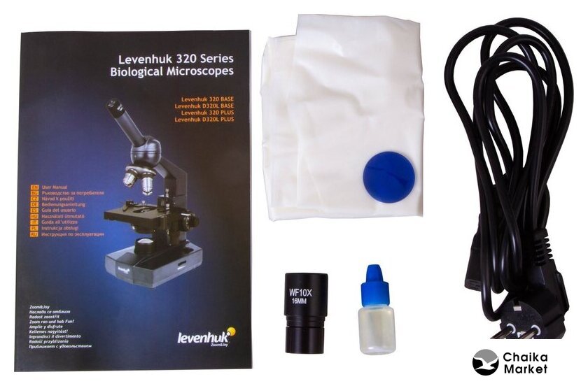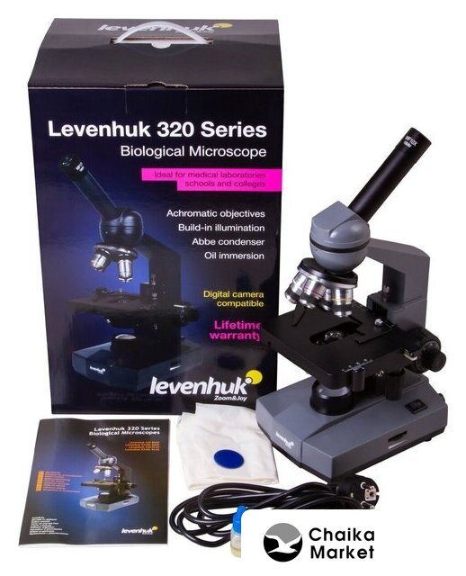 | Состав набора | микроскоп, ахроматические объективы: 4х, 10х, 40х и 100х (масляная иммерсия), широкий окуляр WF10x, синий фильтр, флакон иммерсионного масла, сетевой адаптер, пылезащитный чехол, инструкция по эксплуатации и гарантийный талон |