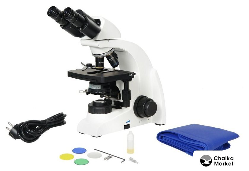 | Состав набора | штатив микроскопа, бинокулярная насадка, револьвер на 4 гнезда для объективов, предметный столик, конденсор Аббе, объективы (4x, 10x, 40x, 100x), окуляры, светофильтры, галогенная лампа, винты для конденсора, вставка плавкая, сетевой кабель, пузырек с иммерсионным маслом, чехол пылезащитный, руководство по эксплуатации |