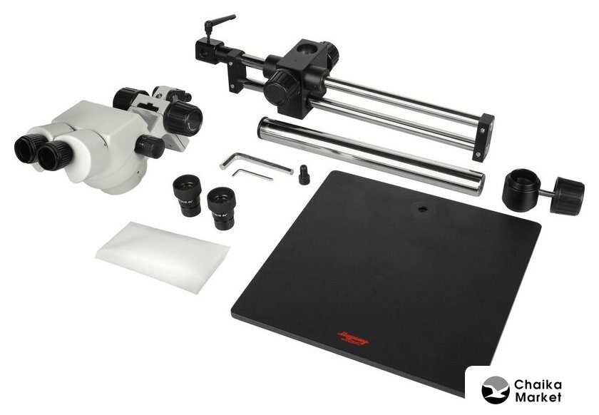 Состав набора | бинокулярная оптическая головка с блоком объективов, окулярные тубусы и механизмом зуммирования; кронштейн оптической головки с поворотным адаптером; горизонтальная направляющая в сборе; штативная штанга с ограничительной муфтой; основание микроскопа; окуляры WF 10х/20 мм; наглазники резиновые на окуляры; болт крепления штативной штанги; рукоятка крепления кронштейна; винт крепления оптической головки; рукоятки подвижной каретки направляющей; ключ шестигранный 10 мм; ключ шестигранный 4 мм; руководство по эксплуатации; гарантийный талон |