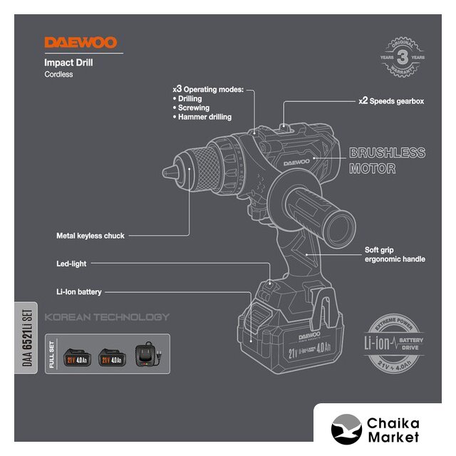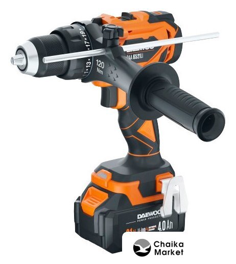 Комплектация | - Дрель-шуруповерт - 1 шт.- Аккумулятор 4,0 Ач - 2 шт.- Зарядное устройство - 1 шт.- Дополнительная рукоятка - 1 шт.- Скоба для крепления - 1 шт.- Инструкция- Кейс |