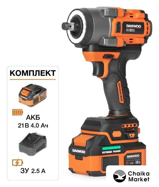 | Комплектация | - Гайковерт - 1 шт.- Аккумулятор 4,0 Ач - 1 шт.- Зарядное устройство - 1 шт.- Торцевые головки (17, 19, 21 мм) - 3 шт.- Инструкция- Кейс |