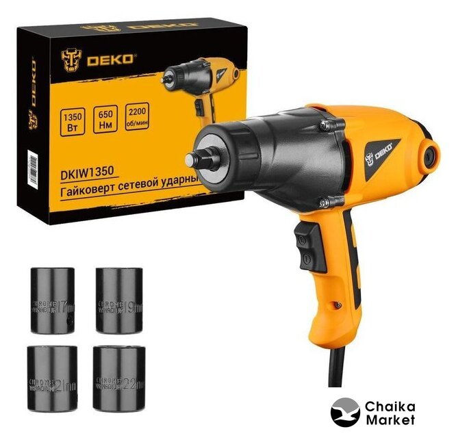 Комплектация | - Гайковерт - 1 шт.- Головки: CR-V (17мм, 19мм, 21мм, 22мм) - 4 шт.- Инструкция.- Коробка. |