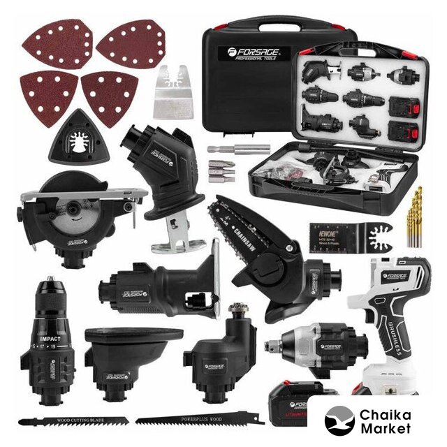 Комплектация | - Основной блок для насадок 1шт.;- Насадка ножницы-кусторез 1 шт.;- Сверлильная головка 1шт. (с 6 спиральными сверлами, 3 битами и 1 держателем бит);- Головка ударной дрели 1шт.;- Головка ударной отвертки 1шт.;- Головка ударного гайковерта 1шт.;- Головка сабельной пилы 1шт.(с 1 лезвием для резки дерева 150 мм);- Головка лобзика 1шт. (с 1 лезвием для резки дерева 100 мм);- Головка циркулярной пилы 1шт.(с лезвием 1 шт. 85 мм);- Головка электропилы 1шт. (с цепью 1 шт.);- Осциллирующая головка инструмента 1шт.(с аксессуарами 5 шт.);- Шлифовальная головка 1шт.(с шлифовальной бумагой 2 шт.);- Аккумулятор 4,0 Ач 2шт.;- Зарядное устройство 1шт.;- Кейс. |