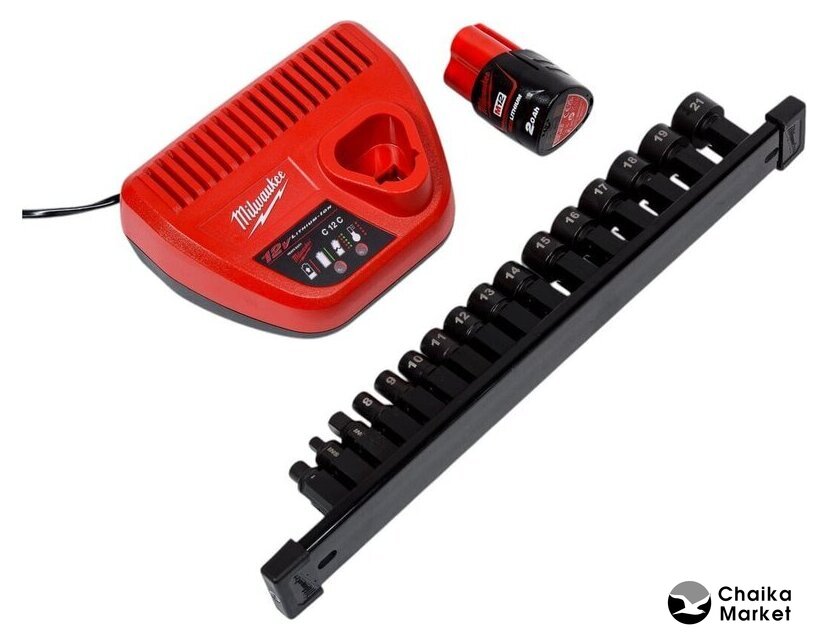 | Комплектация | - сквозная головка 8–15 мм- головка 16–19 мм- головка 21 мм- адаптер ¼″- адаптер ⅜″- держатель для бит ¼″- 2 x M12 B2 аккумуляторные наборы- C12 C зарядное устройство- динакейс |