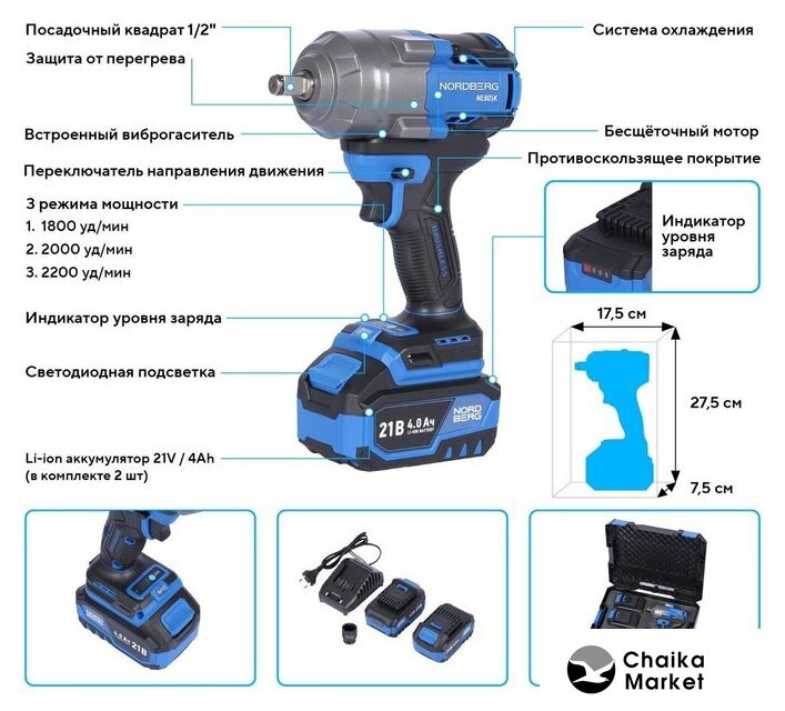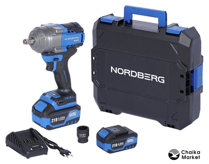 | Комплектация | - Аккумуляторный гайковерт – 1 шт;, - Аккумулятор 21В / 4Ач – 2 шт;, - Зарядное устройство 21В / 1,8А – 1 шт;, - Кейс для хранения – 1 шт;, - Инструкция по эксплуатации – 1 шт. |