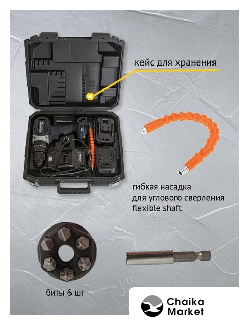 | Комплектация | - дрель, - биты 6 шт.,- удлинитель для бит, - гибкая насадка для углового сверления (flexible shaft), - аккумуляторная батарея 2 шт., - зарядное устройство, - чемодан для хранения и переноски, - клипса для крепления на ремень, руководство по эксплуатации, - гарантийный талон. |