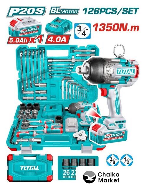 | Комплектация | Аккумуляторный ударный гайковёрт TIWLI201351Аккумулятор 5.0 А·ч — 1 шт. (TFBLI20531)Зарядное устройство 4 А — 1 шт. (TFCLI20411)Ударные головки 3/4":4 шт.: 26, 27, 30, 32 ммГоловки и оснастка 1/2":Трещотка — 1 шт.Универсальный шарнир — 1 шт.Головки — 7 шт.: 21, 22, 23, 24, 27, 30, 32 ммУдлинённые головки — 5 шт.: 14, 15, 17, 19, 21 ммСвечные головки — 2 шт.: 16 мм, 21 ммУдлинители — 2 шт.: 125 мм, 250 ммПереходник — 1 шт.: 3/8"(F) × 1/2"(M)Головки и оснастка 3/8":Трещотка — 1 шт.Универсальный шарнир — 1 шт.Головки — 10 шт.: 10–19 ммУдлинители — 2 шт.: 75 мм, 150 ммБиты и бит-головки:Бит-головки 1/4" × 32 мм — 18 шт.:HEX: 3, 4, 5, 6, 8 ммTORX: T8, T10, T15, T20, T25, T30, T40SL: 5.5, 6.5PH2, PH3PZ2, PZ3Биты 6.35 × 25 мм — 40 шт. (PH, PZ, SL, TORX, HEX)Держатель бит 1/4" — 1 шт. Адаптер 1/4" — 1 шт.: 3/8"(F) × 1/4"(M)Вороток-спиннер 1/4" × 150 мм — 1 шт.Ключи и ручной инструмент:Комбинированные ключи — 12 шт.: 10, 11, 12, 13, 14, 15, 17, 18, 19, 21, 22, 24 ммШестигранные ключи (HEX) — 10 шт.: 2,5–14 ммОтвёртки — 2 шт.: SL6.5×150 мм, PH2×150 ммСъёмник масляного фильтра — 1 шт.Упаковка:Прочный кейс для хранения и транспортировки |