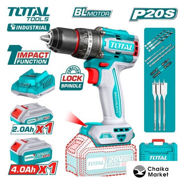 | Комплектация | - Ударная дрель-шуруповерт - 1 шт.- Аккумулятор 2,0 Ач TFBLI20011 - 1 шт.- Аккумулятор 4,0 Ач TFBLI20021 - 1 шт.- Зарядное устройство TFCLI20411 - 1 шт.- Двухсторонняя бита PH2+PH2 - 1 шт.- Двухсторонняя бита PH2+SL6 - 1 шт.- Сверло по дереву (16, 19, 22 мм) - 3 шт.- Сверло HSS по металлу (4, 5, 6 мм) - 3 шт.- Сверло по камню (5, 6, 8 мм) - 3 шт.- Инструкция- Кейс |