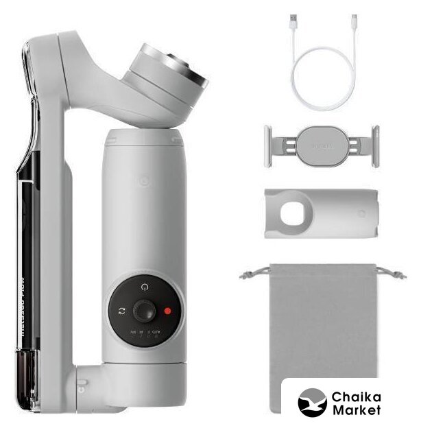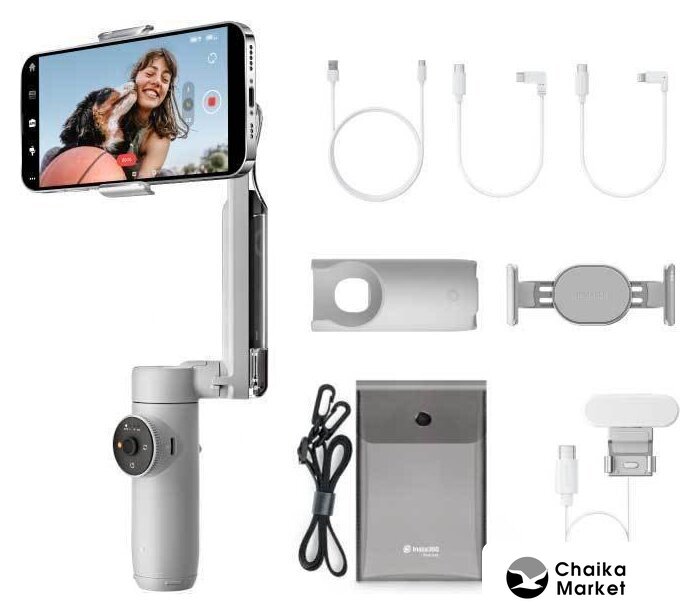 | Комплектация | - Insta360 Flow;- Прожектор;- Магнитный зажим для телефона;- Крышка ручки;- Сумка для переноски;- Зарядный кабель Type-C - A;- Кабель Type-C - C;- Телефонный кабель Type-C;- Lightning. |